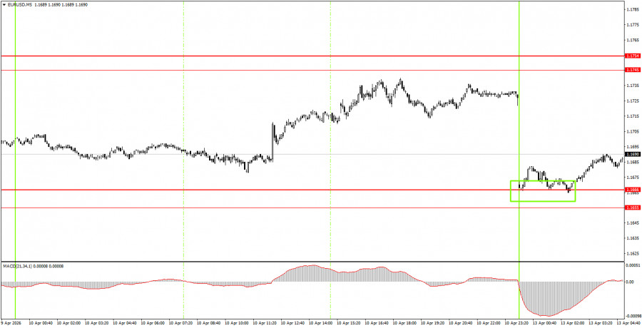 Валютная пара EUR/USD в течение пятницы продолжала довольно слабое восходящее движение, а во второй половине дня в Америке вышел достаточно важный отчет по инфляции за март и чуть позже – индекс настроения потребителей от университета Мичиган. Сразу же можно сказать, что никакой реакции рынка не последовало и на эти отчеты, а все наиболее интересные события развивались в субботу и воскресение. Началось все с того, что переговоры между Ираном и США в Исламабаде провалились. Обе стороны отметили отсутствие прогресса в наиболее важных вопросах, касающихся Ормузского пролива и ядерной энергетики. Таким образом, мира достичь не удалось, а перемирие может быть завершено в любой момент. Также сегодня ночью стало известно, что Дональд Трамп намерен заблокировать Ормузский пролив для иранских судов, чтобы сделать невозможным экспорт иранской нефти в Китай и другие страны Азии и не только. Таким образом, утром в понедельник мы можем констатировать факт эскалации войны на Ближнем Востоке, а не наоборот. Доллар тут же подорожал на 80 пунктов...5M график пары EUR/USD.