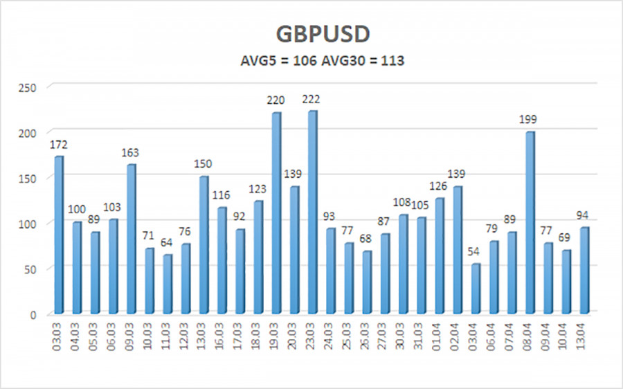 Валютная пара GBP/USD в течение понедельника также торговалась в нисходящем русле, что абсолютно закономерно. Вероятно, некоторые эксперты ожидали, что уже к обеду доллар вырастет пунктов на 200, но куда рынку спешить? Все не геополитические факторы он игнорирует, времени для покупок американской валюты у него – хоть отбавляй. Поэтому мы считаем, что доллар просто начнет планомерный рост на фоне новой эскалации на Ближнем Востоке. В чем заключается новая эскалация? Она заключается в угрозах Дональда Трампа заблокировать Ормузский пролив. Многие трейдеры могут задаться вопросом: зачем блокировать заблокированный пролив? Трамп хочет заблокировать его для иранских танкеров и кораблей. Проще говоря, Иран заблокировал пролив, чтобы нефть из враждебных стран региона не попала на мировые рынки. По сути, это шантаж всего мира, потому что агрессию в отношении Ирана проявили Штаты, а высокие цены на топливо, нефть и газ достались всем. Теперь же американский президент хочет заставить Иран страдать его же методом – попросту обрезать поставки нефти из Ирана в Китай и другие страны Дальнего Востока. Насколько это возможно? Честно говоря, угрозы Трампа выглядят нереалистично. Трамп уже обещал «уничтожить иранскую нацию», захватить остров Харг и много чего еще. Однако практически любой военный эксперт вам скажет, что подобного масштаба операции вызовут огромные потери среди американской армии, огромные финансовые траты. А их положительный результат абсолютно не гарантирован. По большому счету, подобная операция – это авантюра, и лидер Белого дома это отлично понимает. Однако козырей на руках у Трампа осталось немного. Ему больше нечем надавить на Иран, чтобы добиться от него подписания мирного соглашения на условиях Вашингтона. Иран показал готовность защищать свой политический режим, вектор международной и внутренней политики, свою независимость и суверенитет столько, сколько будет нужно. А в планы Трампа вовсе не входит бомбежка Ирана на протяжении следующих нескольких лет. Тем более, что Иран активно отвечает по тем странам, до которых могут долететь его ракеты и дроны. Тем временем, цены на нефть растут, а Иран угрожает в случае блокировки Ормузского пролива Америкой заблокировать еще и Баб-эль-Мандебский пролив, что точно приведет к росту цен на нефть до 150-200$ за баррель. Кто будет виновником в этом случае? Тот же человек, что и сейчас – Дональд Трамп. Кто проголосует за Республиканскую партию в ноябре 2026 года, если цены на нефть вырастут еще на 50-100$ за баррель? Никто. Поэтому Трамп отчаянно пытается найти выход из ситуации, которую сам же и создал. Пока что мы не видим никаких шансов на завершение конфликта на американских условиях. А Дональд Трамп вместо дешевого доллара может теперь порадоваться растущему доллару, вместо смягчения монетарной политики ФРС получить ее ужесточение, так как инфляция только в марте подскочила на 0,9% в годовом выражении. Средняя волатильность пары GBP/USD за последние 5 торговых дней составляет 106 пунктов. Для пары фунт/доллар это значение является «средним». Во вторник, 14 апреля, таким образом, мы ожидаем движения внутри диапазона, ограниченного уровнями 1,3349 и 1,3561. Старший канал линейной регрессии развернулся вниз, что указывает на смену тренда. Индикатор CCI заходил в область перекупленности, что предупре