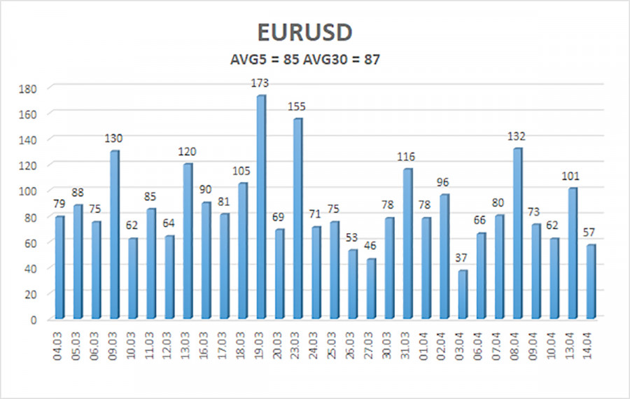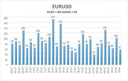 Валютная пара EUR/USD в течение вторника продолжала восходящее движение, которое началось еще на прошлой неделе. Напомним, что именно прошлая неделя стала знаковой для рынка. И мы сейчас говорим не о двухнедельном перемирии Ирана и США, не об отчетах по ВВП или инфляции в США, не о переговорах в Исламабаде. Мы говорим о глобальной смене настроений среди трейдеров. Напомним, что любое движение любого инструмента на любом рынке при желании можно объяснить. Даже если объяснение не соответствует истине. И абсолютное большинство экспертов именно этим обычно и занимается – просто объясняет движения постфактум. Какой в этом смысл? В течение последних 2 месяцев мы постоянно говорили о том, что доллар растет исключительно на геополитическом факторе, и даже этот фактор не спасет его от долгосрочного падения. Фактор геополитики не может поддерживать американскую валюту вечно, а рынок не может постоянно игнорировать все факторы, кроме геополитики. И вот за последние полторы недели пара EUR/USD выросла на 300 пунктов и оказалась около 18-го уровня. А 18-й уровень – это всего лишь в 250 пунктах от максимума европейской валюты за последние 4 года. Как только рынок насытился безопасным долларом, фактором геополитики, как доллар тут же вернулся в привычное для себя русло при Дональде Трампе – нисходящее. И теперь пара EUR/USD вновь располагается очень недалеко от своих максимальных значений. А ведь еще 2 недели назад казалось, что доллар США будет расти большую часть 2026 года. Если в последние два месяца рынок торговал исключительно на геополитике, то теперь он торгует против нее. Посудите сами, на прошлой неделе лишь в среду у рынка имелись основания для покупок евро или фунта, так как именно в этот день было установлено перемирие на Ближнем Востоке. Перемирие, которое было нарушено в ту же среду. На выходных стало известно, что Иран и США в очередной раз не смогли договориться друг с другом по вопросу ядерной энергетики(вот неожиданность!), а в понедельник Дональд Трамп приказал своему флоту заблокировать Ормузский пролив для иранских танкеров и любых других танкеров, которые готовы платить Ирану за использование пролива. Таким образом, если бы рынок и дальше торговал на геополитике, то на прошлой неделе мы бы не увидели столь сильного роста евровалюты, а на этой неделе мы увидели бы обвал евровалюты. Однако евро растет и уже в ближайшее время может вернуться туда, откуда началось падение в конце января текущего года. Восходящий тренд, как мы уже говорили много раз, сохраняется, что прекрасно видно на дневном и недельном ТФ. Ну а дальше мы будем ждать дальнейшего роста европейской валюты по одной простой, как камень, причине – Дональд Трамп. В 2026 году в «заслуги» Трампа добавилось разжигание полномасштабной войны на Ближнем Востоке, которое уже спровоцировало энергетический кризис по всему миру. Трамп продолжает упорно добиваться не «золотого века» для США, а «каменного». Средняя волатильность валютной пары EUR/USD за последние 5 торговых дней по состоянию на 15 апреля составляет 85 пунктов и характеризуется, как «средняя». Мы ожидаем движение пары между уровнями 1,1706 и 1,1876 в среду. Старший канал линейной регрессии развернулся вниз, что указывает на смену тренда на нисходящий. Однако фактически сейчас может возобновиться восходящий тренд. Индикатор CCI заходил в