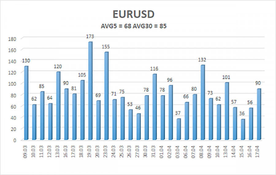 Валютная пара EUR/USD в течение последних двух недель торговалась с повышением, но, кажется, теперь уже сказка европейской валюты подходит к концу. В последние недели рынок верил в то, что переговоры между Вашингтоном и Тегераном завершатся хотя бы открытием Ормузского пролива и завершением боевых действий. Ормузский пролив действительно был открыт в пятницу. Как выяснилось позже, только для того, чтобы оказаться снова закрытым в субботу. На этот раз США и Иран не смогли договориться об американской блокаде пролива. Иран сначала заявил, что блокада будет снята, так как Израиль и Ливан сумели договориться о прекращении огня на 10 дней. Однако чуть позже стало известно, что Иран свою блокаду снял, а США – нет. Поэтому иранские порты остались заблокированными, что, конечно же, не устроило Тегеран. По состоянию на текущий момент пролив вновь заблокирован, а цены на нефть уже сегодня могут вновь поползти вверх. Вместе с курсом американской валюты. Как мы уже говорили много раз, достичь всеобъемлющего соглашения Вашингтону и Тегерану будет крайне тяжело. Ключевым вопросом был и остается вопрос ядерной энергетики. В воскресение стало известно, что Иран в очередной раз отказался от вывоза всего обогащенного урана за пределы своей территории, поэтому мы даже не понимаем, о чем ведут переговоры участники конфликта? Очевидно, что Иран не откажется от ядерной энергетики и вооружений. Чего хочет добиться Трамп на этих переговорах – неясно. Из-за нового закрытия Ормуза и нового провала в переговорах доллар на новой неделе может вновь перейти в рост. А от этих событий будут зависеть практически все остальные. К примеру, мы практически уверены в том, что макроэкономические публикации вновь не будут иметь никакого значения для трейдеров. Поэтому даже рассматривать их не будем. В понедельник и среду должны состояться выступления председателя ЕЦБ Кристин Лагард, чья риторика в отношении монетарной политики вновь может измениться. Напомним, что на прошлой неделе госпожа Лагард сообщила об отсутствии необходимости спешить с повышением ставок, так как обстановка на Ближнем Востоке может наладиться. Однако мы пока не видим, что может наладиться в ближайшее время. Прекращение огня – это позитивный факт, но сколько оно будет продолжаться, если стороны не могут найти точки соприкосновения по ключевым вопросам? Если соглашение не будет подписано, а Ормузский пролив останется заблокированным, то снижения цен на нефть можно не ждать. Следовательно, инфляция по всему миру будет продолжать расти. И в этом случае ЕЦБ может вновь изменить настрой на более «ястребиный». Таким образом, выступления Лагард мы считаем наиболее значимыми событиями в Евросоюзе. Однако даже без выступлений Лагард спрос на валюту США может вновь начать расти. Просто потому, что наиболее позитивные ожидания рынка по Ближнему Востоку не подтверждаются на практике. Средняя волатильность валютной пары EUR/USD за последние 5 торговых дней по состоянию на 20 апреля составляет 68 пунктов и характеризуется, как «средняя». Мы ожидаем движение пары между уровнями 1,1698 и 1,1834 в понедельник. Старший канал линейной регрессии развернулся вниз, что указывает на смену тренда на нисходящий. Однако фактически сейчас может возобновиться восходящий тренд 2025 года. Индикатор CCI заходил в область перекупл