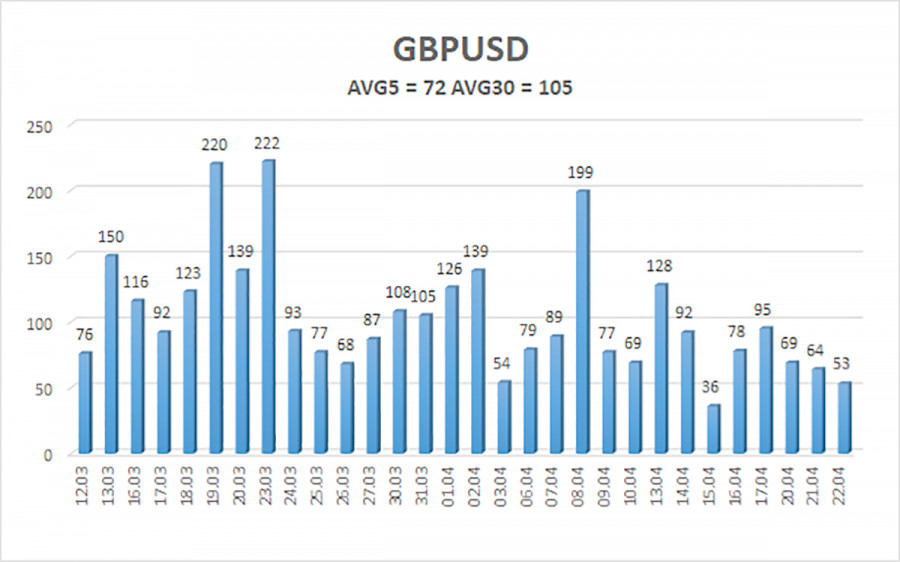 Валютная пара GBP/USD в течение среды продолжала торговаться в узком ценовом диапазоне с невысокой волатильностью. Таким образом, мы продолжаем считать, что пара просто корректируется, при чем на технических основаниях. Почему именно на технических? Мы говорили об этом еще на выходных. Все наиболее резонансные геополитические варианты развития событий уже отработаны, сама геополитика начала отходить на второй план, так как рынок не может постоянно торговать только на одном факторе. В то же время обратно к макроэкономике и фундаменту трейдеры возвращаться не спешат. В итоге получается патовая ситуация, когда геополитика не обладает силой для стимуляции движения на Юг или на Север, а все остальные факторы рынок игнорирует. Поэтому – техническая коррекция. Во вторник и в среду в Великобритании было опубликовано минимум два важных отчета. Ни на первый, ни на второй реакции рынка не последовало. При чем, мы констатируем именно отсутствие любой реакции, а не закономерность происходящего. Начнем с уровня безработицы. Этот показатель снизился по итогам марта с 5,2% до 4,9%. Согласитесь, не каждый месяц безработица падает сразу на 0,3%. Поэтому еще во вторник британская валюта имела прекрасную возможность продолжить движение на Север. Этого не случилось, потому что рынок продолжает игнорировать макроэкономическую статистику. А аналитики вновь пытаются объяснить любое движение или отсутствие оного, в чем заключается принципиальная ошибка. Многие эксперты забывают, что любое фундаментальное или макроэкономическое событие – это не приказ рынку торговать в определенном направлении, который нельзя не исполнить. Трейдеры могут отрабатывать его, а могут и не отрабатывать по собственному желанию. И если для них сейчас важнее геополитика, то никто не может заставить их торговать. Если сейчас на рынке пауза, никто не может заставить его торговать. Поэтому не стоит искать в британских отчетах «ложку дегтя», чтобы объяснить отсутствие роста британского фунта, или же наоборот, «ложку меда», чтобы обосновать отсутствие его падения. Отчет по инфляции возвестил об ускорении потребительских цен всего лишь до 3,3%, а базовая инфляция по итогам марта и вовсе замедлилась. Так как фактическое значение совпало с прогнозами, никакой реакции рынка и не должно было случится. Тем не менее, отметим, что многие трейдеры ожидали куда более сильного роста инфляции. К примеру, в Европе индекс потребительских цен ускорился сразу на 0,7% в марте, а в США – на 0,9%. Таким образом, Британия со своими +0,3% не впечатлила. И такое слабое ускорение показателя как раз дает основания для продаж британского фунта, так как на Туманном Альбионе появилась надежда на то, что конфликт не Ближнем Востоке повлияет на экономику достаточно слабо. Британия неплохо обеспечена собственными энергоносителями, поэтому может лучше справляться с инфляционным давлением. Таким образом, на текущий момент Банк Англии может себе позволить продолжать наблюдать за происходящим без ужесточения монетарной политики. Правда, для трейдеров и этот фактор не имеет особого значения. Техническая коррекция. Средняя волатильность пары GBP/USD за последние 5 торговых дней составляет 72 пункта. Для пары фунт/доллар это значение является «средним». В четверг, 23 апреля, таким образом, мы ожидаем движения внутри диапазо