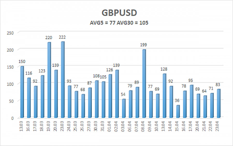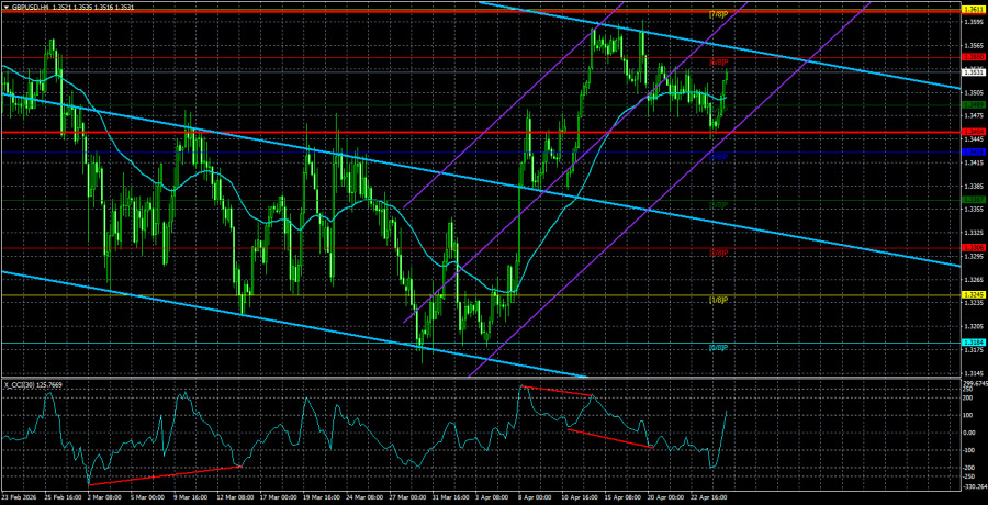 Валютная пара GBP/USD в течение следующей недели также может торговаться очень волатильно, а направление движения будет зависеть от многочисленных событий, которые запланированы в Великобритании и США, а также могут произойти на Ближнем Востоке. Начнем с темы наиболее простой(с нашей точки зрения) – геополитики. Здесь что-либо прогнозировать – все равно, что пытаться угадать, когда на Землю высадятся инопланетяне. Абсолютно в любой момент конфликт может, как продолжить свой пусть деэскалации, так и вспыхнуть с новыми силами. Напомним, что ни Вашингтон, ни Тегеран не намерены разблокировать Ормузский пролив. Штаты настаивают на переговорах и подписании сделки на их условиях, а Тегеран настаивает на снятии блокады иранских портов, и лишь после этого допускает переговоры. Поэтому ситуация остается патовой. Однако это не означает, что конфликт не может эскалировать. Зная Дональда Трампа, в любой момент он может отдать приказ о нанесении нового удара по Ирану. В частности, по электростанциям и мостам, как он уже давно обещает. Следует понимать, что затяжной конфликт в Иране вряд ли входит в планы Трампа. До выборов в Конгресс остается шесть месяцев. Не так уже много, если задуматься. Чем дольше длится неразбериха с войной в Иране, с Ормузским проливом, с ценами на нефть и газ, тем меньше шансов у Республиканской партии на победу хотя бы в одной палате Конгресса. На что могут рассчитывать республиканцы? На скорое завершение конфликта, снижение цен на топливо, замедление инфляции. В этом случае американские потребители и избиратели быстро забудут интервенцию Трампа в Иран, тем более что она далеко не первая за последние 15 месяцев и, вероятно, не последняя. В Великобритании и США состояться также заседания центральных банков, однако ожидания по обоим событиям стали практически полностью нейтральными за последние недели. ФРС изначально не была настроена на ужесточение политики или на дальнейшее смягчение, а Банк Англии допускал повышение ставок в апреле, но последний отчет по инфляции показал, что цены растут с началом войны в Иране ненамного быстрее, до нее. Поэтому, вероятнее всего, Британский регулятор также не будет менять параметры монетарной политики. Тем не менее, сопроводительные заявления и выступления глав могут многое прояснить в планах регуляторов. Помимо этого, в Штатах будет опубликовано по меньшей мере три важных отчета. Индекс деловой активности ISM в производственном секторе, заказы на товары длительного использования и первая оценка ВВП в первом квартале 2026 года. Конечно, рынок спокойно может проигнорировать все эти события, и вновь сосредоточить внимание только на геополитике. Последние несколько заседаний центральных банков не спровоцировали сильной реакции рынка, а макроэкономику трейдеры игнорируют уже больше двух месяцев. Однако на следующей неделе трейдерам будет все же очень непросто игнорировать настолько сильный поток новостей. Поэтому мы ждем, как минимум, высокой волатильности. Средняя волатильность пары GBP/USD за последние 5 торговых дней составляет 77 пунктов. Для пары фунт/доллар это значение является «средним». В понедельник, 27 апреля, таким образом, мы ожидаем движения внутри диапазона, ограниченного уровнями 1,3454 и 1,3608. Старший канал линейной регрессии направлен вниз, что указывает на нисходящую т