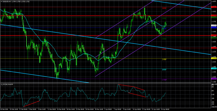 Валютная пара EUR/USD новую неделю начала с восходящего движения, хотя особых причин для покупок пары у трейдеров не было. Хотим сразу же заметить, что в мире каждый день происходит огромное количество событий и новостей, вот только зачем они нужны валютному трейдеру, если никакого влияния на курс доллара или евро они не оказывают? К примеру, на выходных состоялось уже второе «покушение» на Дональда Трампа. В первом случае стрелок филигранно угодил в ухо президенту США, при чем после того инцидента никто ни разу не видел Трамп с какими-либо травами или увечьями слухового аппарата. Кем нужно быть, чтобы с расстояния в несколько сот метров со снайперской винтовки попасть в ухо, нам сложно себе представить. Во второй раз(на выходных) неизвестный ворвался в Белый дом и открыл огонь по ближайшему представителю службы охраны. При чем в отличие от первого раза попал они лишь в бронежилет, не нанеся никаких увечий секьюрити. Следует отметить, что Трамп в этот момент находился в Белом доме на очередном мероприятии, но до него стрелок не дошел примерно несколько десятков комнат, где на его пути встретились бы несколько сотен охранников. Трамп, естественно, назвал это событие «покушением на его скромную персону», но в принципе, если кортеж Трампа будет продвигаться по одной из улиц Вашингтона, а где-нибудь в трех кварталах очередной злоумышленник откроет огонь, тогда это тоже можно считать покушением. Таким образом, мы на подобные события даже внимания не обращаем. Как и на весь поток геополитических новостей, который продолжает литься с Ближнего Востока, но не имеет никакого смысла и значения. В чем, к примеру, смысл постоянных, ежедневных сообщений о том, что переговоры между Ираном и США то должны возобновиться, то не должны? СМИ уже неделю пишут о различного рода инсайдах и секретной информации, но представители Тегерана и Вашингтона по-прежнему не провели встречу, а Иран по-прежнему стоит на своей позиции: никаких переговоров, пока американцы не снимут блокаду иранских портов. Таким образом, всё, точка – переговоров не будет в ближайшее время. На фоне отсутствия дальнейшего движения в направлении деэскалации конфликта и мира на Ближнем Востоке нефть снова растет в цене, а мировая экономика вновь приближается к рецессии. Следует понимать, что дефицит нефти – это еще не самое страшное. Самое страшное дефицит нефти в совокупности с ростом цен. Если цены на нефть растут, это означает, что все товары и услуги так или иначе будут дорожать. А рост цен на все товары и услуги не означает, что потребители просто будут платить больше. Скорее, они будут покупать и тратить меньше. Раз они будут покупать и тратить меньше, значит промышленное производство будет сокращаться, объемы импорта и экспорта падать, снижаться экономическая и деловая активность, объемы предоставляемых услуг ужиматься. Как следствие – снижение темпов роста экономики. И это сейчас повсеместная проблема. Фактор геополитики отошел на второй план, а долгосрочный восходящий тренд сохраняет свою актуальность. Таким образом, ничто не мешает евровалюте продолжать рост. Средняя волатильность валютной пары EUR/USD за последние 5 торговых дней по состоянию на 28 апреля составляет 59 пунктов и характеризуется, как «средняя». Мы ожидаем движение пары между уровнями 1,1672 и 1,1790 во вторник. Старший 